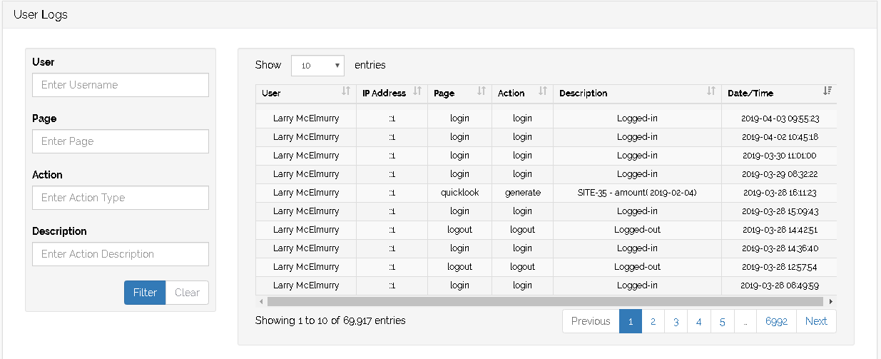 • To filter out user activities fill-up the input fields found in the left side of the page.