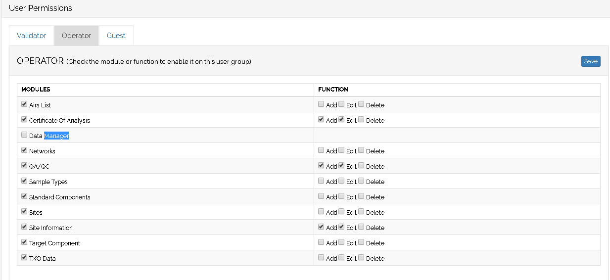 • Scrolling at the bottom of the page is where User Permissions is displayed. This is where the administrator can set user access and functionality limitations for Validator, Operator and Guest users.