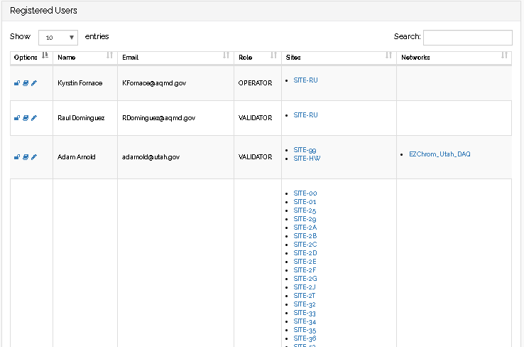 • Right side of the page will contain the registered users, their roles and the the sites they were assigned.