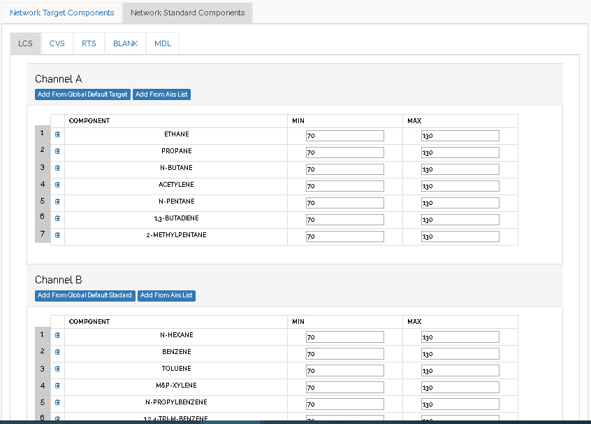 Select wheter lcs, cvs, rts, blank or mdl to edit for channels A and B by clicking the tabs provided.