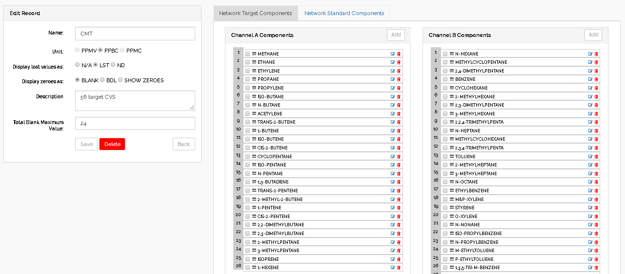 On the right side of the screen the user can add or remove network target components or the different standard components.