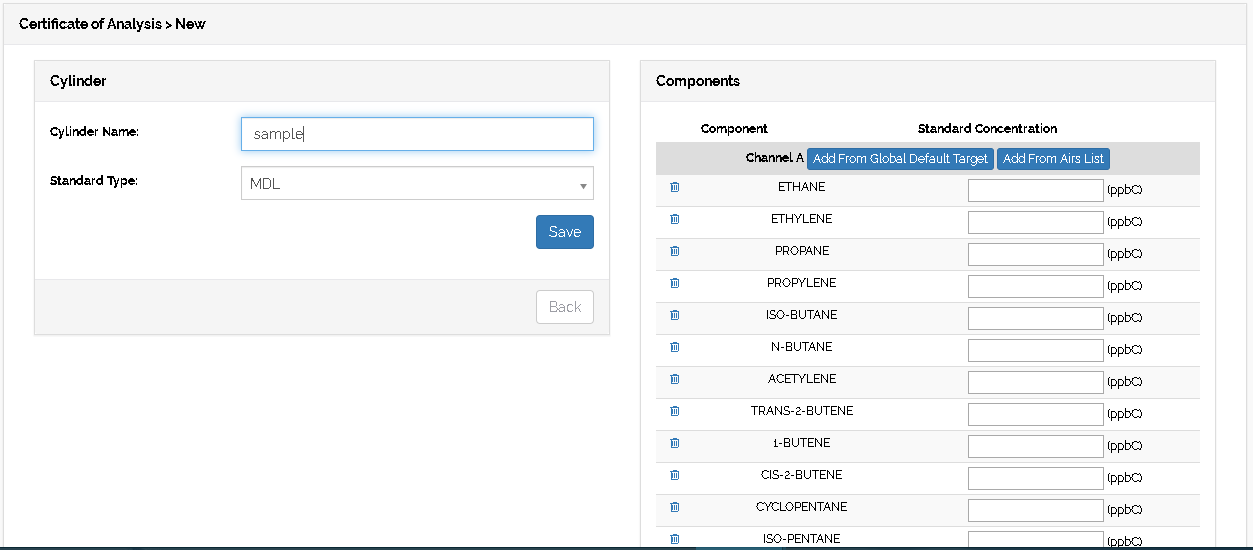 Standard concentration can also be set to a component by filling up the input box aligned to the component name.